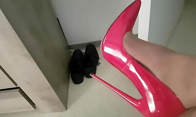 Hot young blonde wearing sexual and very softcore high heel shoes